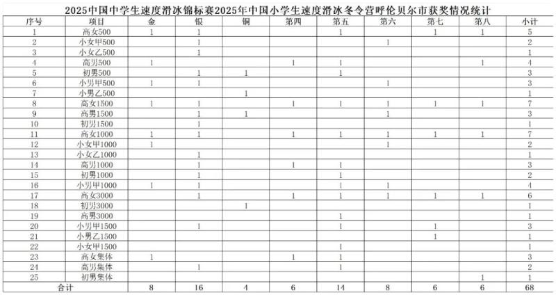 草原冰雪礪筋骨,興安林海育英才。11月26日至30日,2025—2026全國學校冰雪運動系列競賽中學生速滑錦標賽、小學生速滑冬令營在吉林長春圓滿落幕。呼倫貝爾市速滑健兒代表內蒙古自治區出征,以8金16銀4銅,總計28枚獎牌的優異成績,在全國頂級學校冰雪賽事中書寫北疆少年的榮耀篇章,另有40人獲得前八名佳績,為呼倫貝爾市和內蒙古自治區爭得榮光。據統計,呼倫貝爾市代表隊前八名占比23.9%,在全國20支代表隊中位居第二。