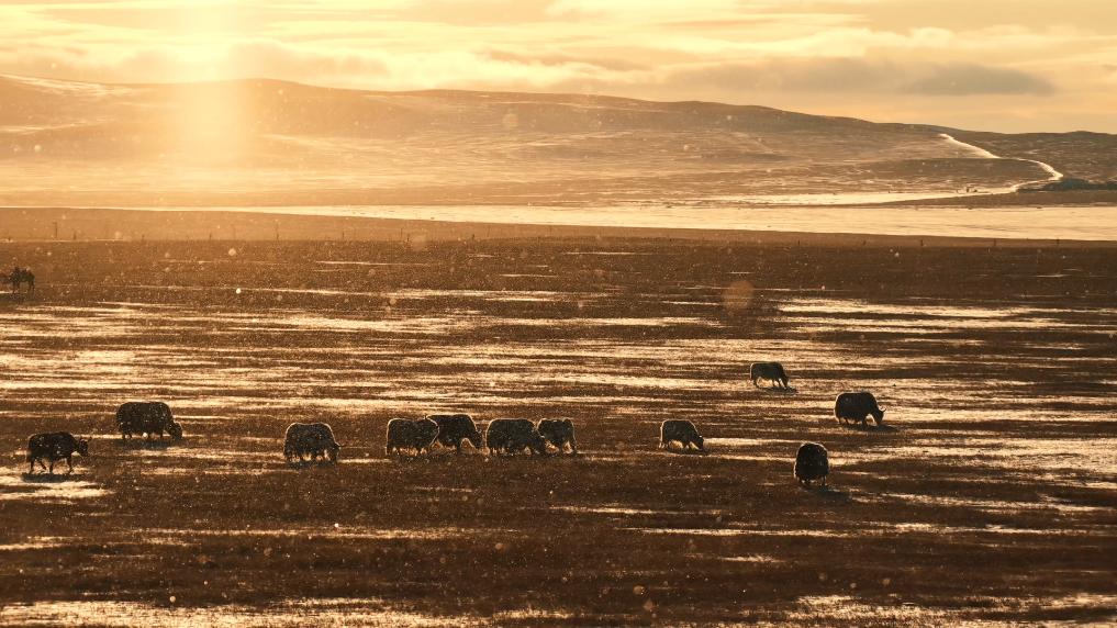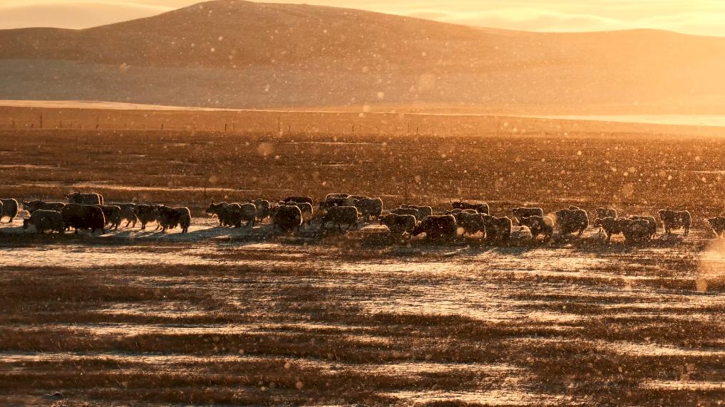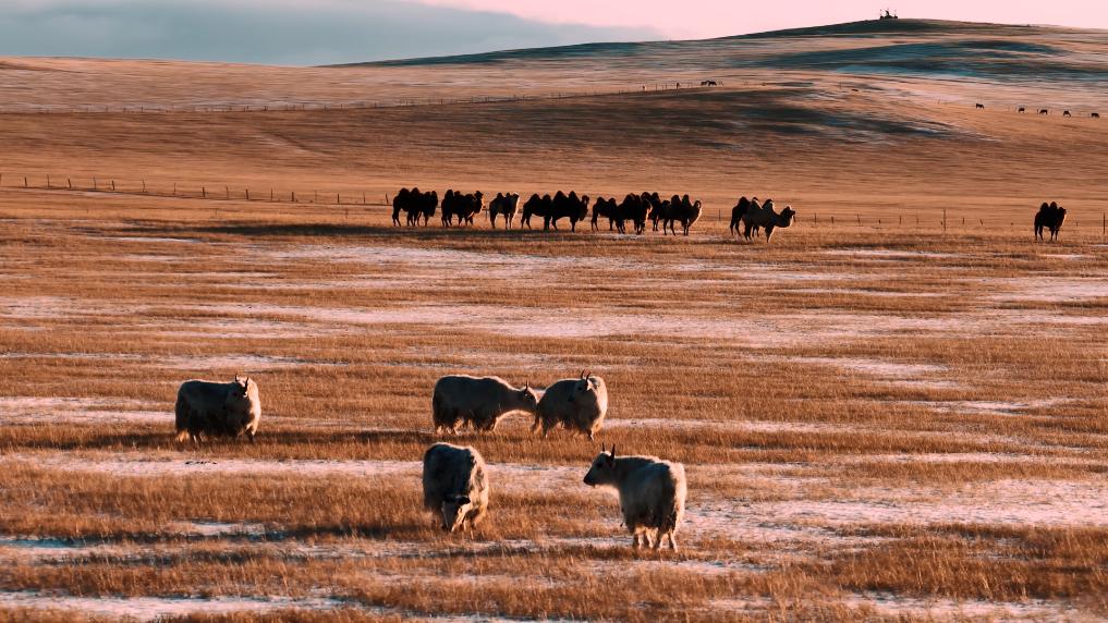 錫林郭勒的落日時分,漫天雪花碎金般飛舞。駱駝群沉穩徜徉,白牦牛群悠閑食草,夕陽逆光讓它們的身影鍍上一層溫暖金邊。